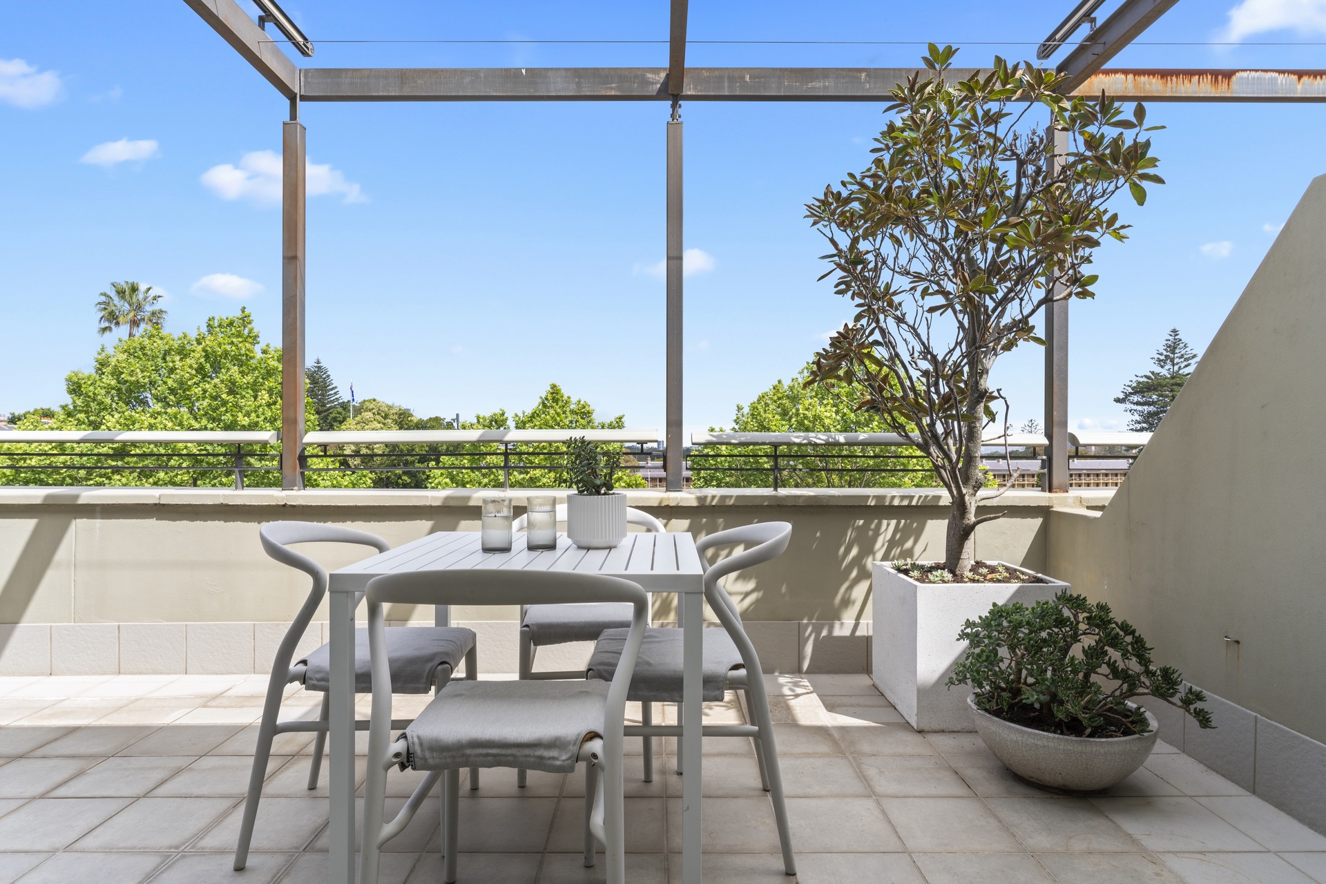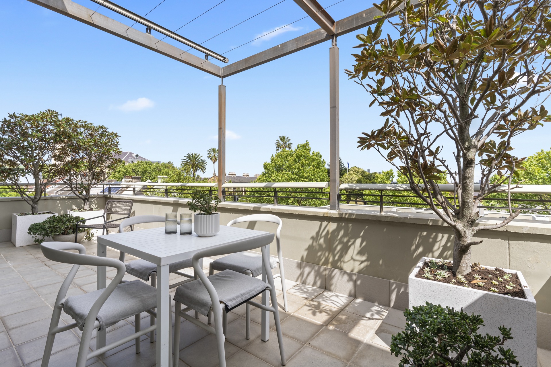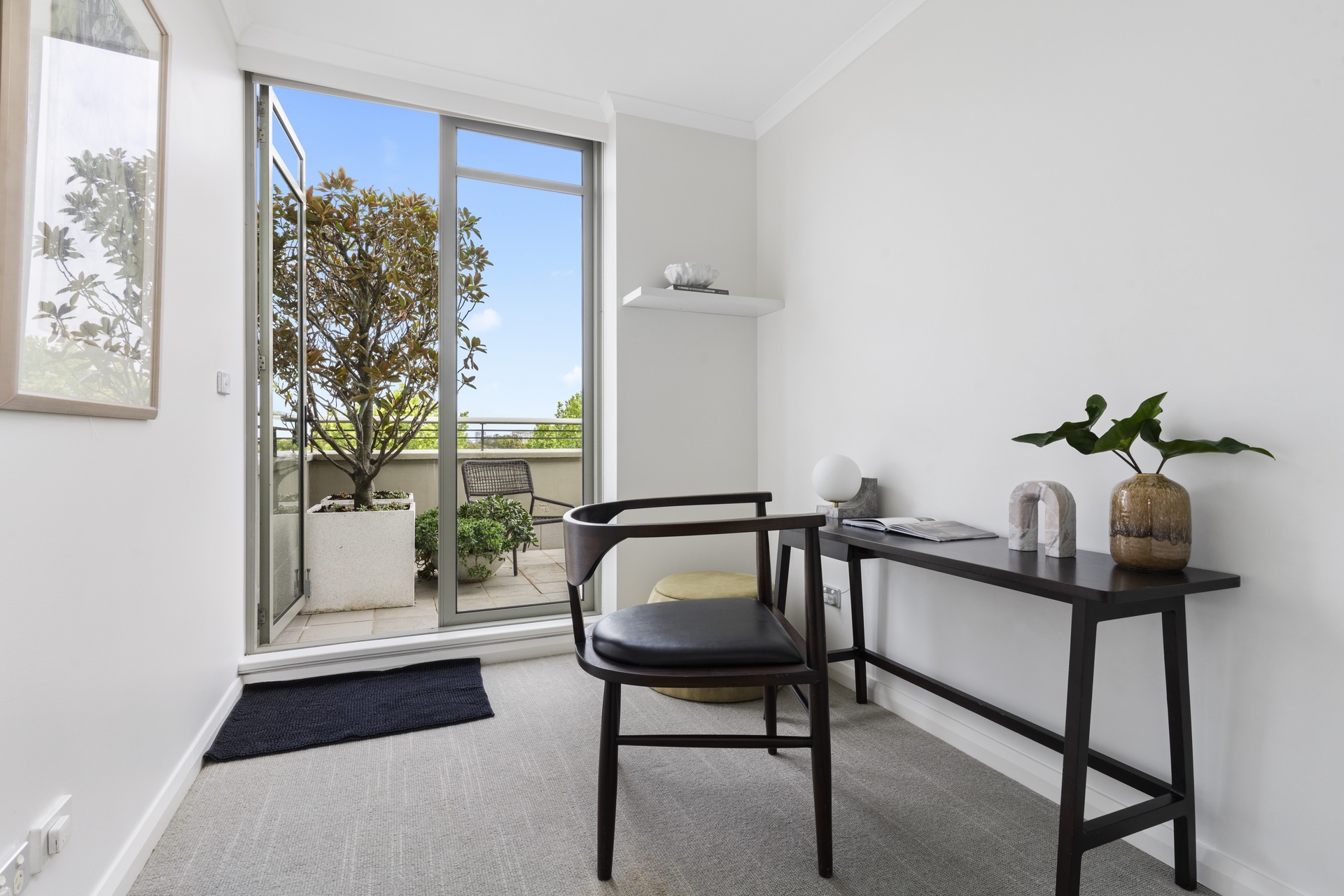 offers a quiet retreat with freshly appointed interiors and leafy district outlooks over Victoria Barracks. It makes an easy-maintenance home with a large outdoor space and a relaxed in/outdoor quality.